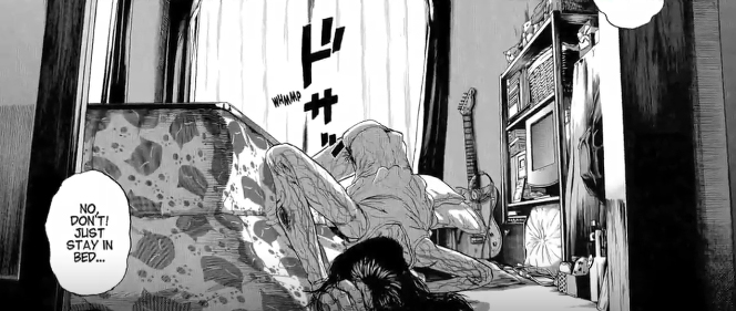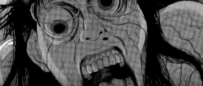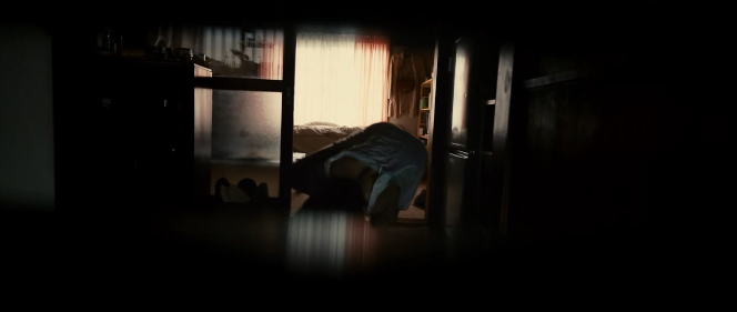 문을 두드리다 신문 투입구 틈으로 안을 들여다 보는데 죽은 듯이 누워있던 뎃코가 갑자기 몸이 뒤틀리며 히데오를 향해 돌진한다.